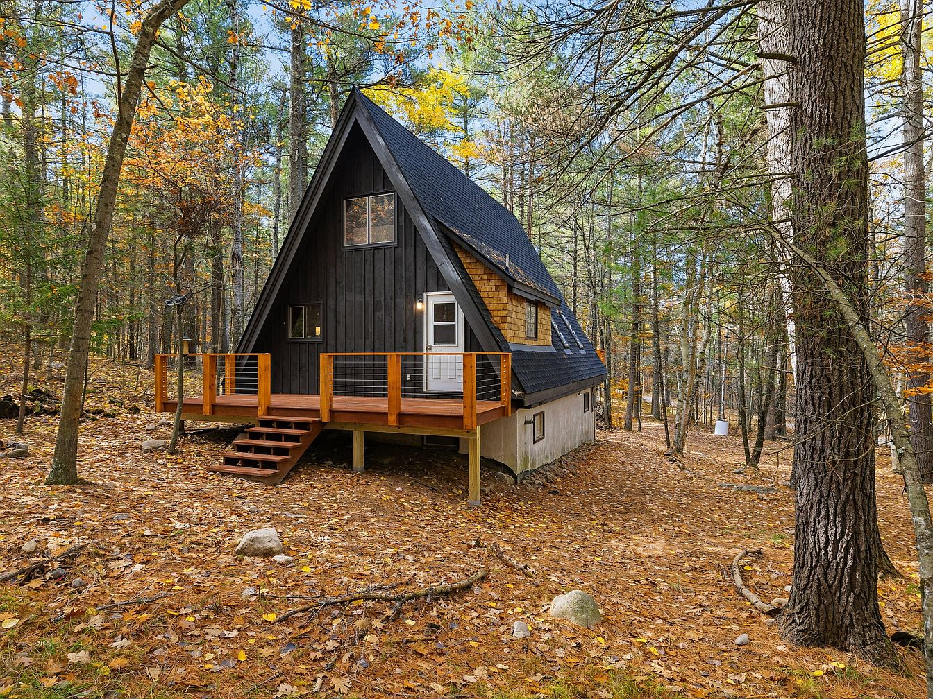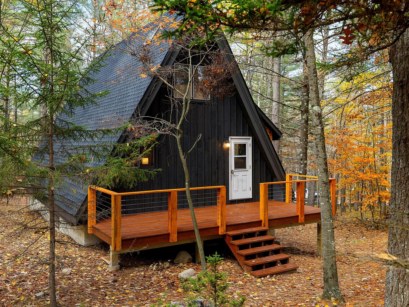 A welcoming A-frame cabin stands nestled among tall pine and deciduous trees, its striking black wood exterior paired with warm natural wood accents on the upper facade and railings. The spacious front porch, accessible via a set of wooden steps, features a safety railing perfect for children and family gatherings, seamlessly blending relaxation with security. Large windows let in ample light, and the simple, clean architectural lines give the home a cozy yet modern look. The house is surrounded by a soft carpet of autumn leaves, ensuring privacy and a peaceful, nature-filled environment ideal for family living and outdoor play.