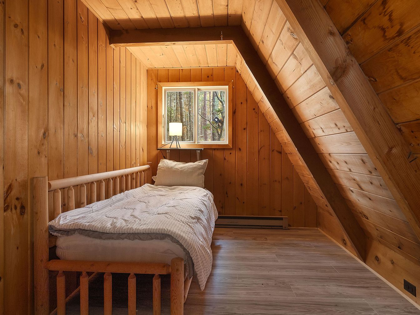 A charming bedroom nook tucked under a sloped wooden ceiling, perfectly sized for a child or guest. Wood-paneled walls and ceiling create a cabin-like warmth, while a large window lets in ample natural light and reveals forest views. The single bed features a rustic log frame and soft bedding, making the space both inviting and safe for children. A simple lamp on a small table by the window adds to the welcoming, homely feel. The clean layout, neutral wood tones, and uncluttered appearance make this nook a serene and family-friendly retreat.