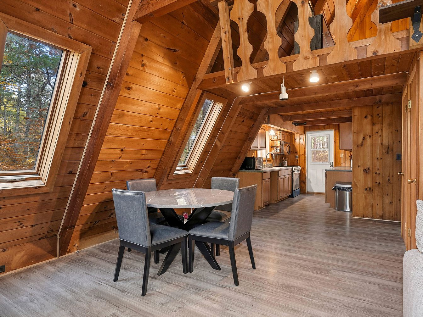 An open-concept dining and kitchen area blends natural wood interiors with modern comfort. Sloping wooden walls form an A-frame structure, featuring two large, angled windows that invite daylight and offer views of surrounding trees. The dining space includes a round table with four upholstered gray chairs, ideal for family meals. The kitchen, set toward the back, is equipped with up-to-date appliances and wooden cabinetry, making meal prep easy. Light laminate floors add contrast and a clean, airy feel. Overhead, a decorative wooden railing hints at a loft space above, adding architectural charm to this family-friendly setting.