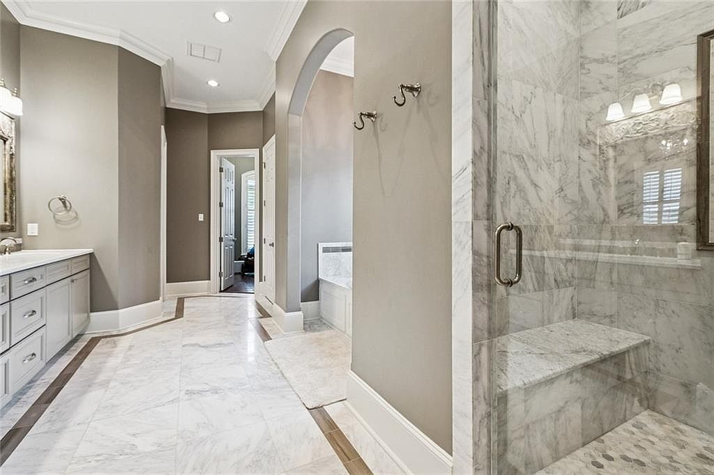 This luxurious master bathroom features a spacious layout with a blend of modern and classic design elements. The soft gray walls create a serene backdrop, complemented by elegant marble flooring that combines light and dark tones. A double vanity with brushed nickel fixtures provides ample storage and style. The walk-in shower, enclosed by glass, showcases pristine marble tiles, while a built-in bench adds comfort. Subtle lighting enhances the ambiance, and decorative mirrors reflect sophistication. A doorway leads to a cozy area with natural light, creating a seamless transition throughout the space, promoting relaxation and tranquility.