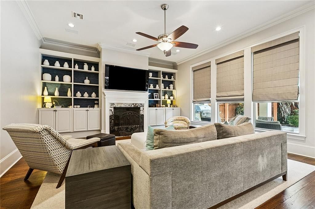 Spacious living room featuring warm, rich hardwood flooring that contrasts with soft, neutral wall colors. A contemporary, light gray sectional couch is positioned centrally, adorned with pastel-colored throw pillows for added comfort. A stylish, textured armchair complements the seating area, providing an inviting atmosphere. The room is brightened by recessed lighting and a ceiling fan, enhancing air circulation. A wall-mounted television aligns above an elegant fireplace, framed with intricate stonework. Beside it, built-in shelves display a curated collection of decorative pottery against a blue backdrop, creating a balance of modern and classic aesthetics.