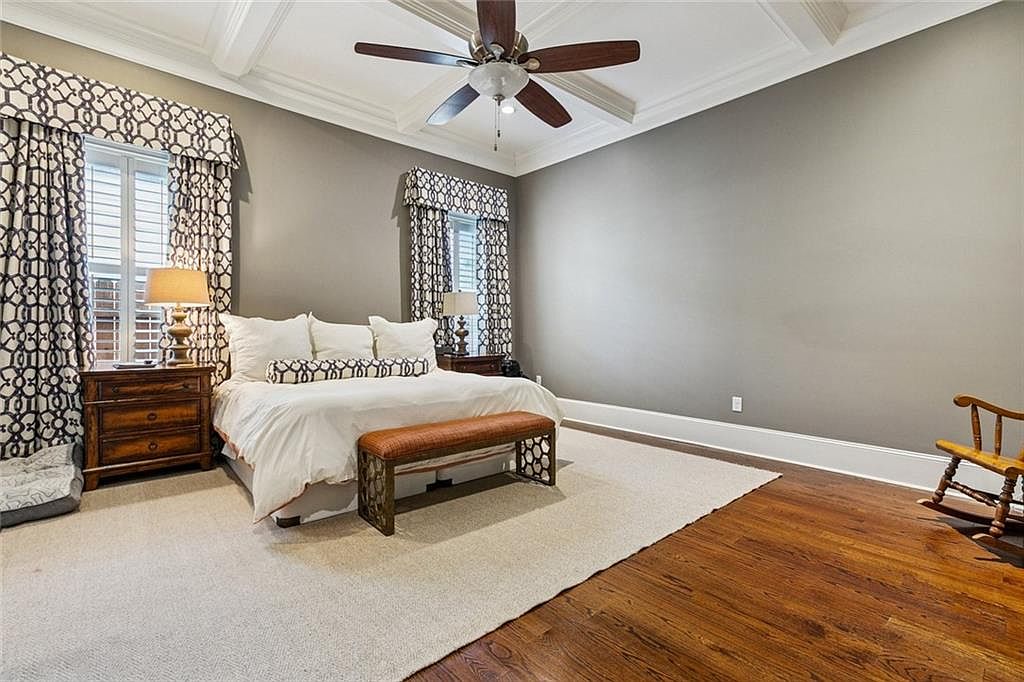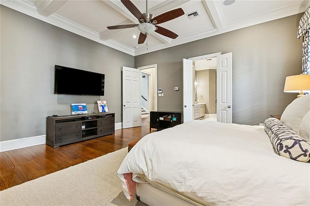 This spacious bedroom showcases a warm color palette of soft gray walls complemented by rich, dark hardwood flooring. A plush area rug anchors the room, adding comfort beneathfoot. The king-sized bed, dressed in a light-colored duvet and accentuated by a patterned throw pillow, commands attention at the center. A modern dark wood dresser with a sleek TV mounted above adds to the contemporary feel. Double doors lead to an adjoining bathroom, while a large window features textured curtains that frame natural light. The coffered ceiling and ceiling fan highlight architectural interest, balancing elegance with functionality.