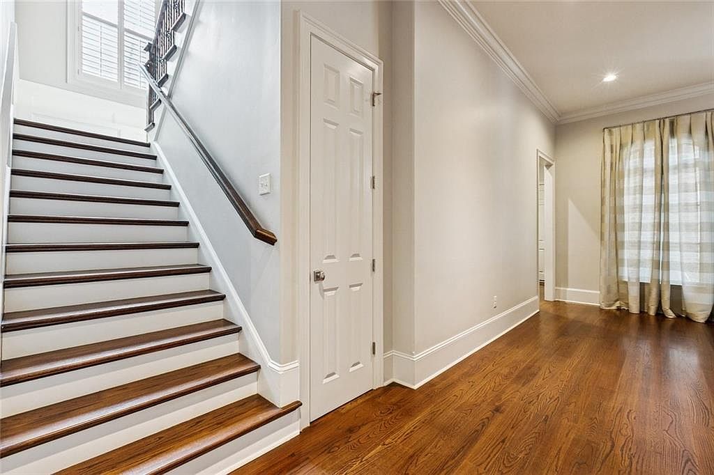 This entryway features a graceful and welcoming atmosphere, highlighted by a polished wooden staircase with elegant, dark banisters. The walls are painted in a soft, neutral tone that harmonizes with the rich, warm hues of the hardwood floor, enhancing the spacious feel. Natural light filters through the upper windows, casting gentle illumination throughout the area. A pair of classic doors to the left opens to additional rooms, while sheer, patterned curtains adorn the window, adding a touch of softness and texture. Crown molding adds subtle sophistication, completing the refined aesthetic of this historic home.