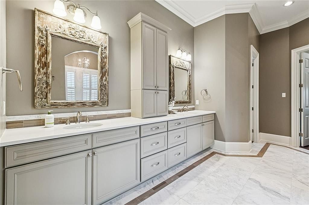 This elegant bathroom features a spacious layout with a double vanity sink seamlessly integrated into the design. The cabinetry, painted in a soft gray, provides ample storage while harmonizing with the light beige walls. A large, intricately framed mirror adds a vintage touch, perfectly reflecting the ambient light from the stylish wall sconces above. The countertop boasts a sleek, white finish, complemented by a subtle striped backsplash. Flooring consists of polished marble tiles, enhancing the luxurious feel. A tasteful chandelier is visible in the background, contributing to the overall sophisticated ambiance of the space.
