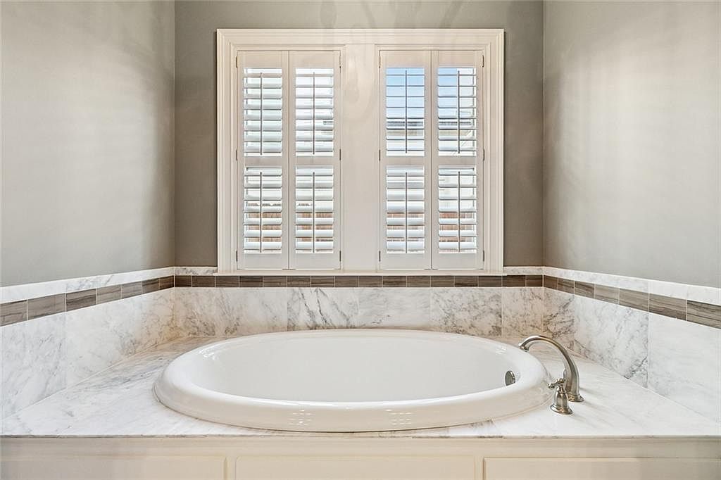 A spacious bathtub is set within a marble countertop, enhancing the elegance of this bathroom space. Surrounding the tub, soft gray walls create a calming backdrop, complemented by white plantation shutters that allow for natural light while maintaining privacy. The meticulously crafted marble features subtle veining, adding sophistication. A decorative mosaic border in earthy tones contrasts with the smooth surfaces, introducing a touch of warmth. The faucet, with its sleek design, underscores a modern aesthetic, combining functionality with style. Overall, the environment exudes luxury and tranquility, inviting relaxation and comfort.