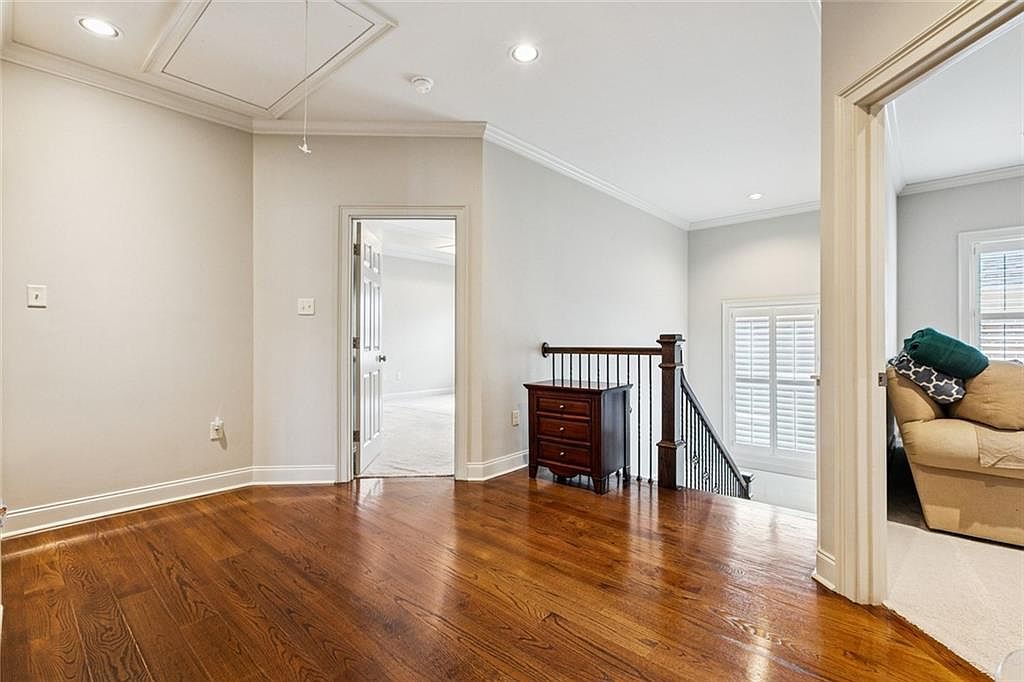 This airy hallway landing features warm, polished hardwood flooring that reflects light, enhancing the spacious feel. Neutral gray walls serve as a backdrop, complemented by bright ceiling lights. A wooden chest stands against the wall, adding a touch of functionality. On the left, a doorway leads to another room, inviting exploration. The elegantly crafted staircase, with its dark wooden banister, leads down, while a cozy seating area to the right incorporates soft beige upholstery and decorative pillows, creating a relaxed corner. Shuttered windows allow filtered natural light, harmonizing the aesthetic with warmth and comfort.