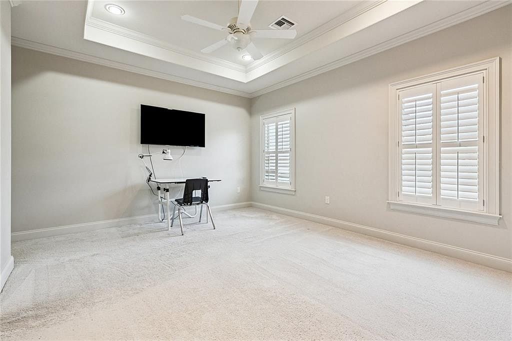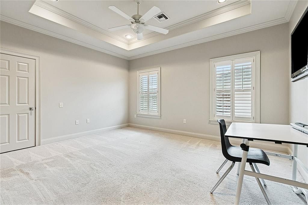 A spacious bedroom featuring a soft, neutral color palette of light gray and beige hues that create a calming atmosphere. The room boasts a textured carpet, adding warmth underfoot. Architectural details include a coffered ceiling with recessed lighting and a ceiling fan that enhances air circulation. Flanking the room are two tall windows with white shutters, allowing natural light while maintaining privacy. A sleek, modern desk with a minimalist black chair provides a functional workspace. The overall layout emphasizes simplicity and openness, with ample space for potential furnishings or personal touches.