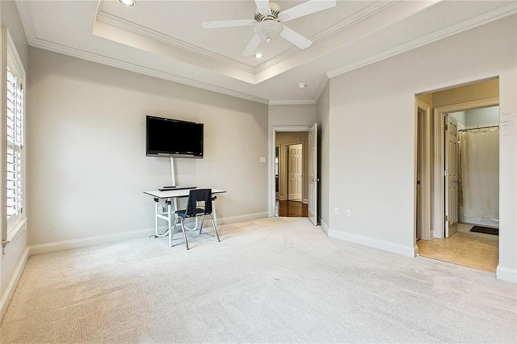 A functional home office space showcases a minimalist design with a neutral color palette of soft beige walls and plush carpeting. Natural light pours in through shuttered windows, illuminating the area. A simple desk and chair setup is arranged facing a mounted flat-screen TV, promoting a clean and uncluttered environment. Architectural details include a coffered ceiling lined with recessed lighting, enhancing the airy feel. Two doorways lead to adjoining rooms, while a bathroom is partially visible. The space balances modern practicality with a serene atmosphere, making it ideal for productivity or relaxation.