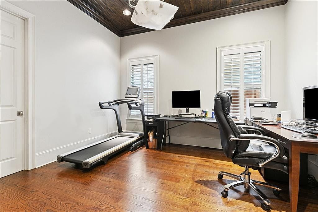 This home office features a functional layout with particular attention to productivity. The hardwood floor displays warm tones, complementing the stark white walls. A dark wood ceiling adds an elegant contrast, enhancing the room’s height. A sleek treadmill occupies one side, promoting fitness alongside work. On the opposite side, a black leather office chair sits before a substantial wooden desk equipped with dual monitors, creating a tech-friendly workspace. Light pours in from the white-shuttered windows, providing natural illumination while maintaining privacy. Overall, the design combines efficiency with comfort, ideal for modern work-life balance.