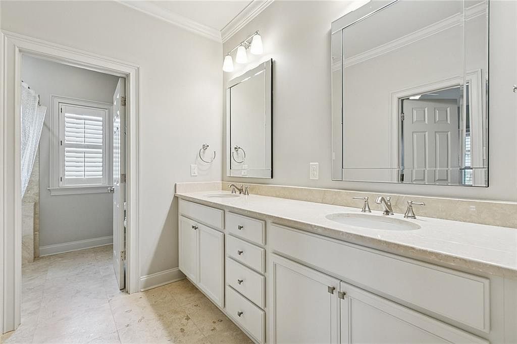 This bathroom features a sleek double vanity with a light-colored stone countertop and white cabinetry, providing ample storage. Spacious mirrors mounted above the sinks reflect the bright, neutral palette of the room. Soft, natural light filters through a window adorned with plantation shutters, adding warmth. The flooring is finished with large, creamy tiles that enhance the airy vibe. To the left, a door leads to a tiled shower area, while another door opens to an additional room, creating a seamless flow. Overall, the design emphasizes modern elegance with clean lines and a serene atmosphere.