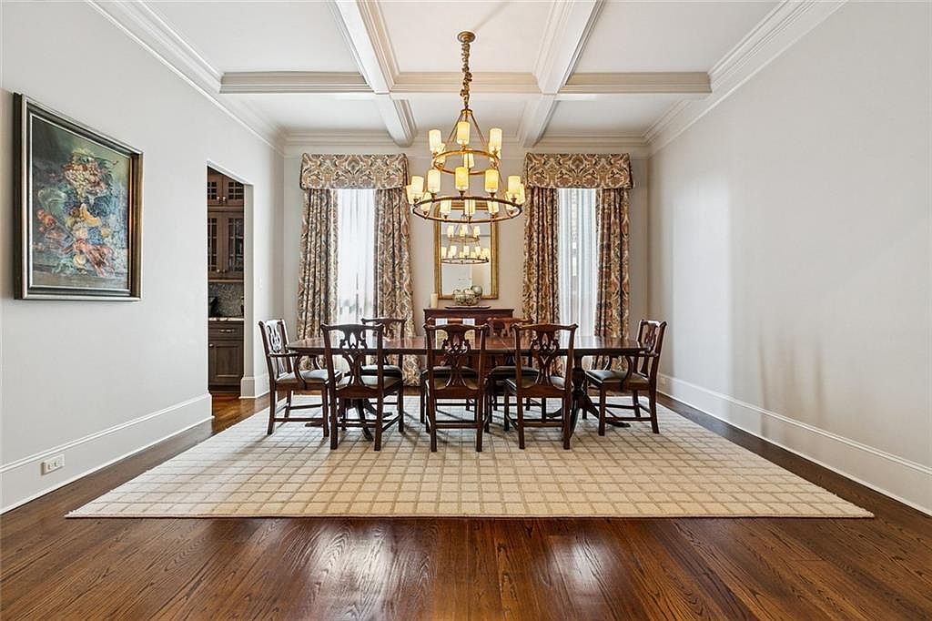 This elegant dining room features a warm color palette with soft beige walls and rich wooden flooring that adds depth. A large, rectangular table is surrounded by classic wooden chairs, showcasing intricate detailing. Overhead, a grand chandelier provides ambient lighting, enhancing the room’s sophistication. Floor-to-ceiling windows, dressed in beautifully patterned drapes, invite natural light while adding a decorative touch. A plush cream area rug lies beneath the table, offering comfort and style. An artistic painting adorns one wall, adding character and visual interest, creating a refined atmosphere perfect for gatherings and special occasions.