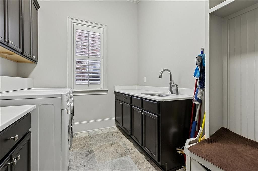 This laundry room blends functionality with modern design. Dark wood cabinetry offers ample storage above white countertops, contrasting elegantly with the light gray walls. A stainless steel sink, centrally positioned, complements the aesthetic while providing utility. The flooring features a stylish, textured stone design, enhancing both durability and appeal. Natural light floods the space through a multi-pane window adorned with wooden blinds, adding warmth. To the right, a small nook with a bench and brooms creates a practical cleaning station. Overall, the room is well-organized, clean, and emphasizes efficiency without sacrificing style.