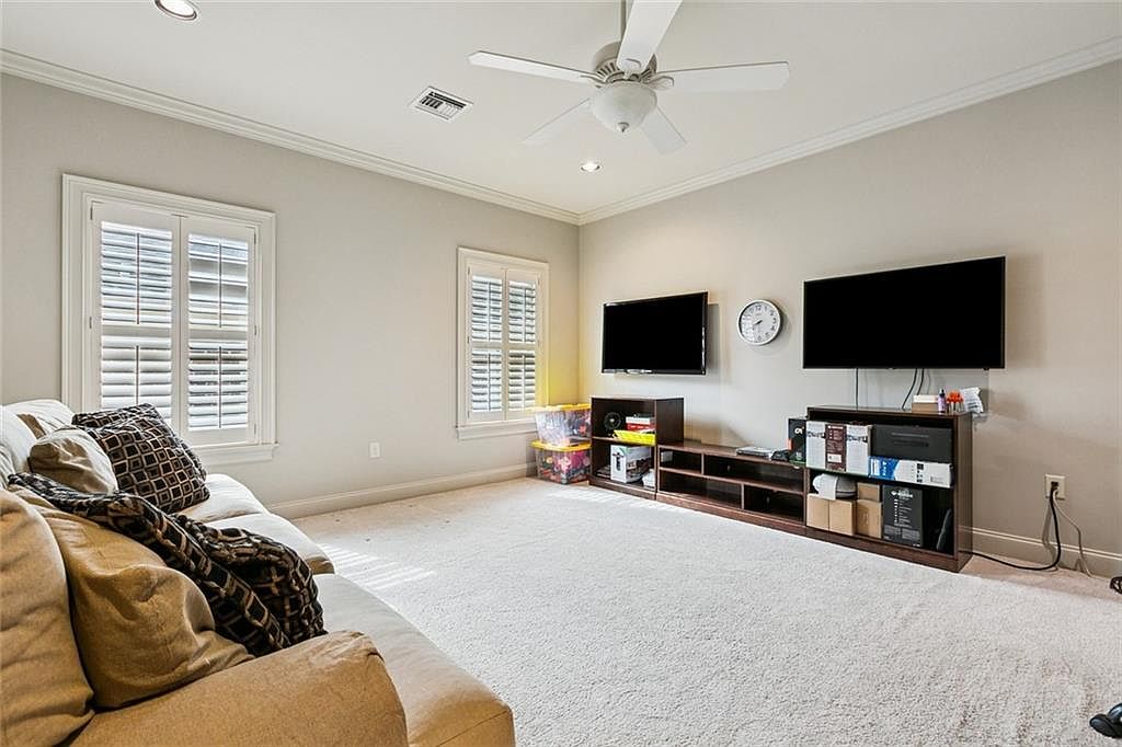 The cozy living room features a light, neutral color palette with soft beige walls and plush carpeting. A large, sectional sofa adorned with patterned throw pillows invites relaxation, while two flat-screen TVs are mounted on the wall opposite. Natural light streams in through two windows fitted with white shutters, enhancing the airy feel. A sleek, dark media console holds various entertainment devices and adds a contemporary touch to the space. Decorative elements include a round clock, with nearby storage optimized for functionality. The ceiling fan provides comfort, seamlessly integrating with the room’s modern yet inviting aesthetics.