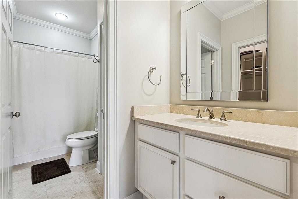 This bathroom features a clean, modern layout with a subtle color palette dominated by soft whites and cream. A light-colored stone countertop sits atop sleek white cabinetry, offering ample storage. The mirror above the sink is framed minimally, enhancing the spacious feel. To the left, a shower with a white curtain maintains privacy, while the adjacent toilet is neatly positioned. The flooring consists of large, light tiles that create an airy ambiance. A small dark bath mat adds contrast. Stylish metallic fixtures complement the overall aesthetic, contributing to a contemporary and inviting atmosphere.