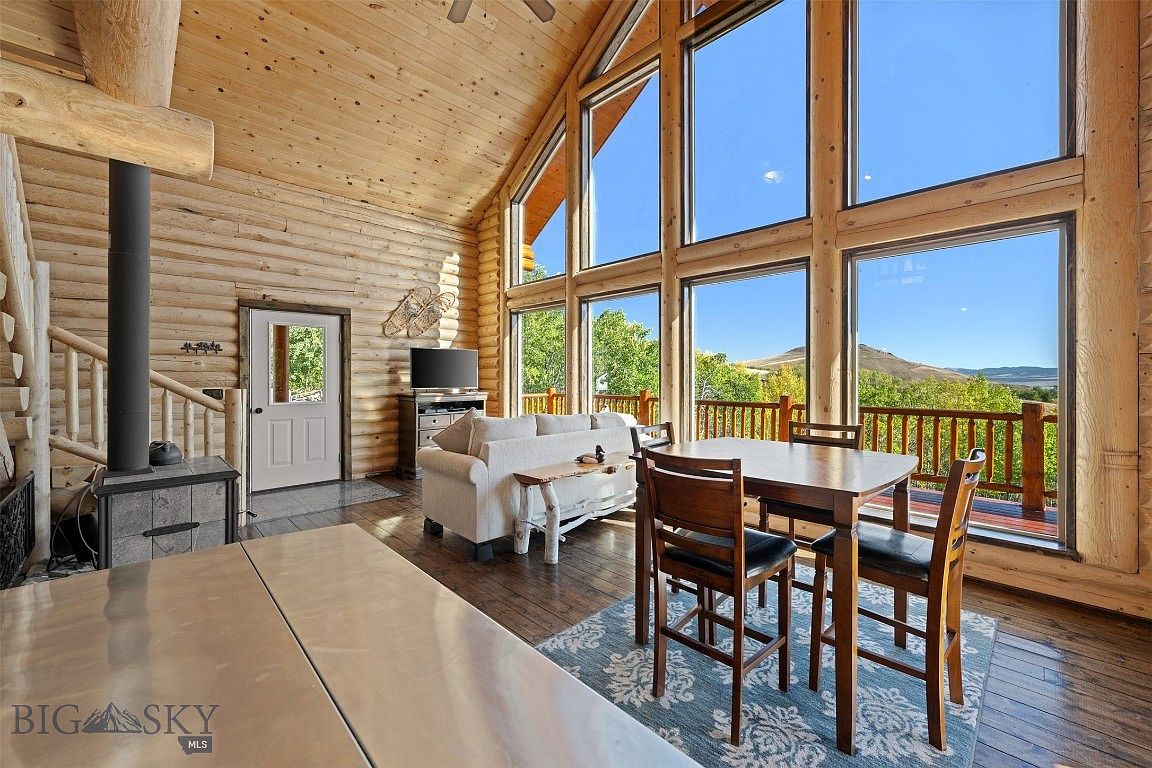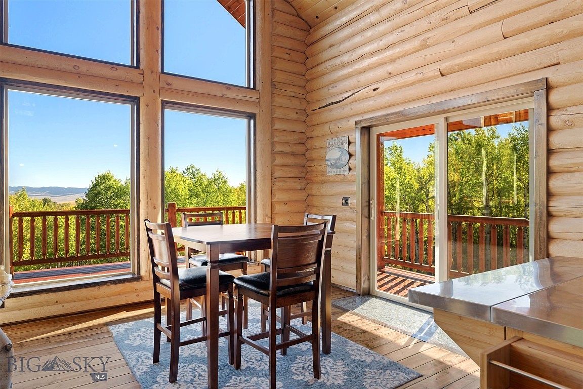 A bright and inviting dining area set within a log cabin-style home, featuring expansive floor-to-ceiling windows that bathe the space in natural light. The wooden dining table, paired with four cushioned chairs, sits atop a soft blue-gray patterned rug, creating a cozy spot for family meals. Honey-hued log walls and ceiling add warmth and rustic charm, while sliding glass doors open directly to a large deck, perfect for easy indoor-outdoor living. The open layout, picturesque views of trees and distant hills, and durable finishes make this a family-friendly and visually appealing gathering space.