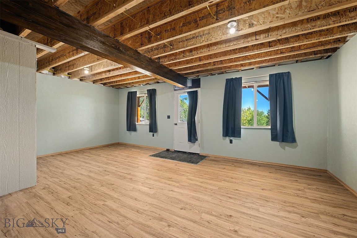 A spacious basement living area features light wood-look flooring, ideal for kids’ playtime or family gatherings. Exposed wooden ceiling beams and natural light streaming in from two sizable windows create a rustic yet bright atmosphere. The white walls are complemented by navy-blue curtains on each window and the door, adding a cozy touch and privacy. An exterior door with a small entry rug offers easy backyard access, perfect for children or entertaining guests. The open layout allows for versatile furniture arrangements, making this a functional, family-friendly space to relax, play, or customize for hobbies and activities.