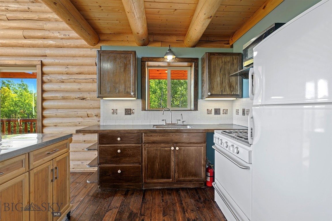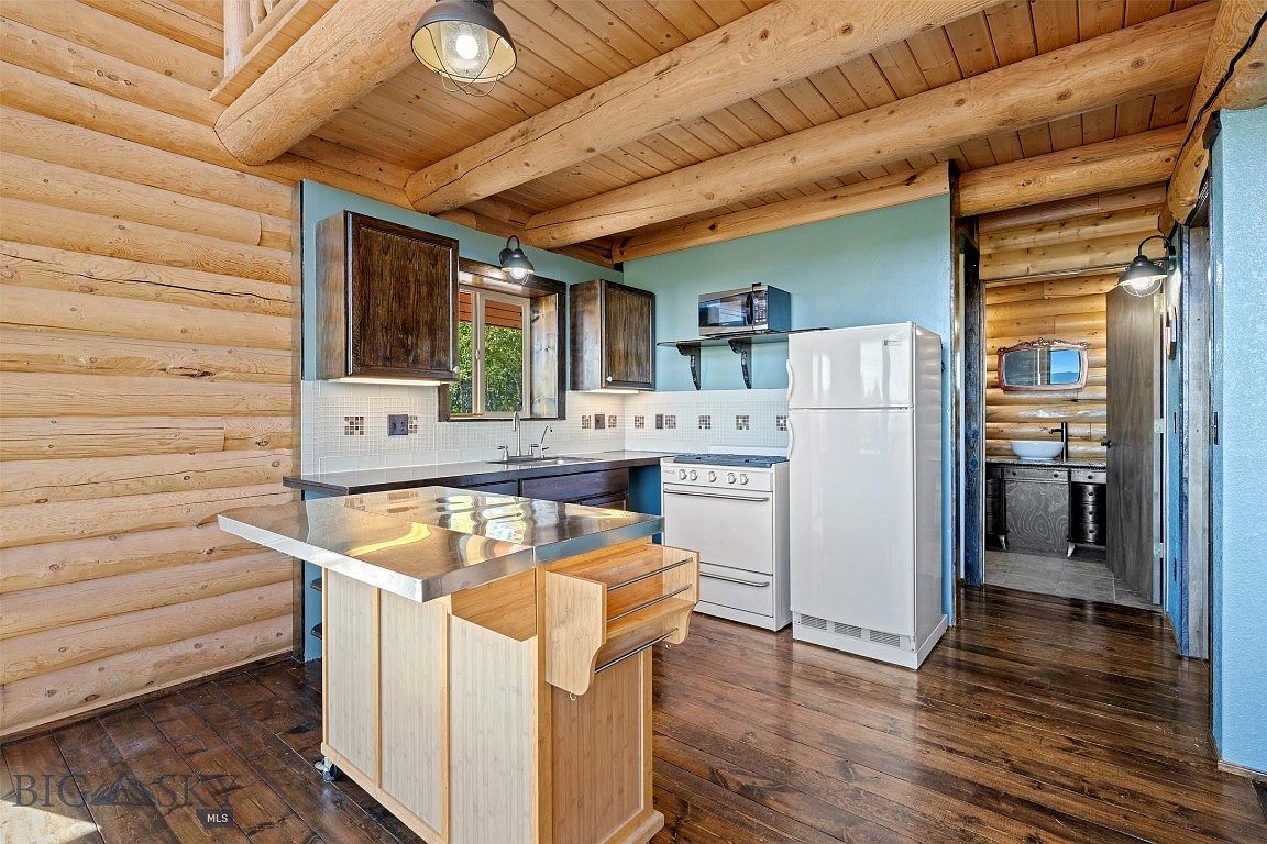 A bright, airy kitchen features natural log walls and exposed wood beams overhead, creating a cozy rustic charm ideal for families. The space includes a sleek stainless steel-topped island with ample drawers, perfect for meal prep or kids’ crafts. A wide window over the sink allows for plenty of natural light, enhancing the warm tones of the wood. There is a compact white refrigerator and stove, with a microwave placed neatly on an open shelf. Dark wood cabinetry contrasts stylishly with the soft blue walls and backsplash. Easy-to-clean hardwood floors make this kitchen practical and welcoming for daily family life.