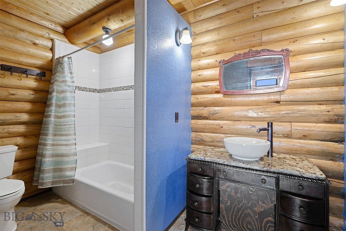 Warm log cabin walls frame this inviting bathroom, blending rustic charm with modern accents. A spacious white-tiled shower and bathtub combination with a mosaic tile border sits adjacent to a bold blue accent wall that adds a touch of vibrancy. The vanity features a granite countertop and an elegant vessel sink, paired with a vintage-inspired framed mirror for a touch of character. Earth-toned tile flooring adds durability and is perfect for families. Subtle details, such as the striped shower curtain and soft lighting, create a cozy and welcoming atmosphere ideal for daily routines and relaxation.