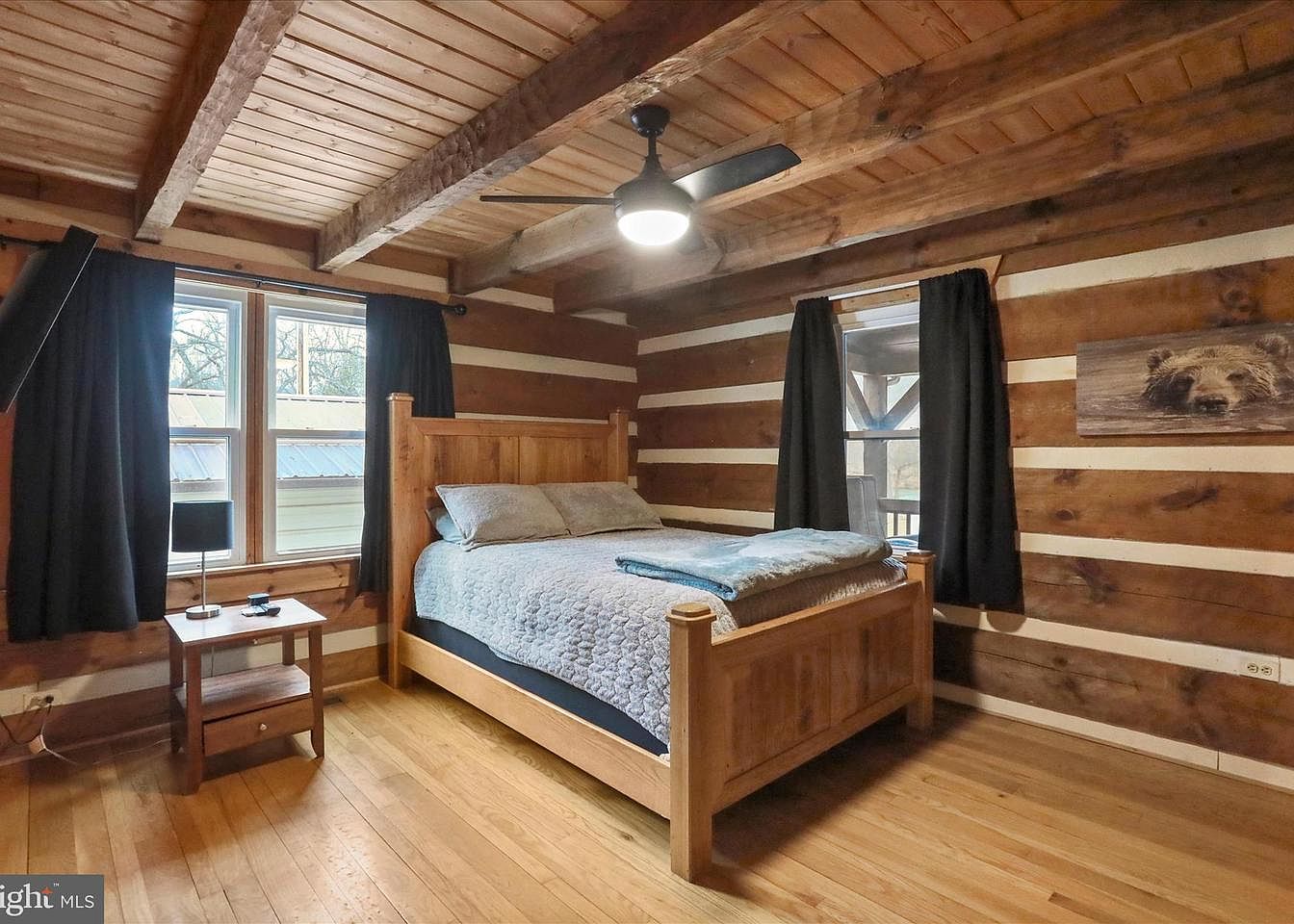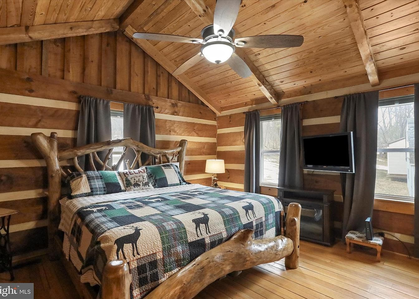 This rustic bedroom features wooden log walls with a warm, inviting atmosphere. The high vaulted ceiling, adorned with exposed beams, enhances the spacious feel. A plush quilt covers a large log-framed bed, paired with accent pillows, contributing to the cozy aesthetic. Natural light streams in through two large windows, bordered by dark gray curtains. A modern ceiling fan offers comfort alongside a bedside lamp that adds a warm glow. A small dresser holds a flat-screen television, blending contemporary and rustic elements. The hardwood floor enhances the natural theme, completing a serene and relaxing haven.