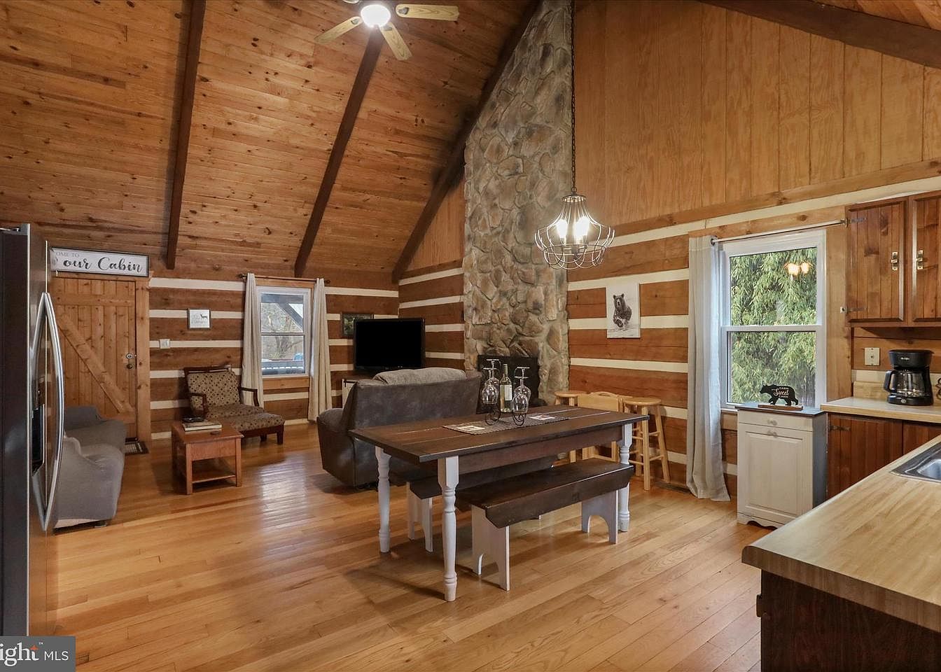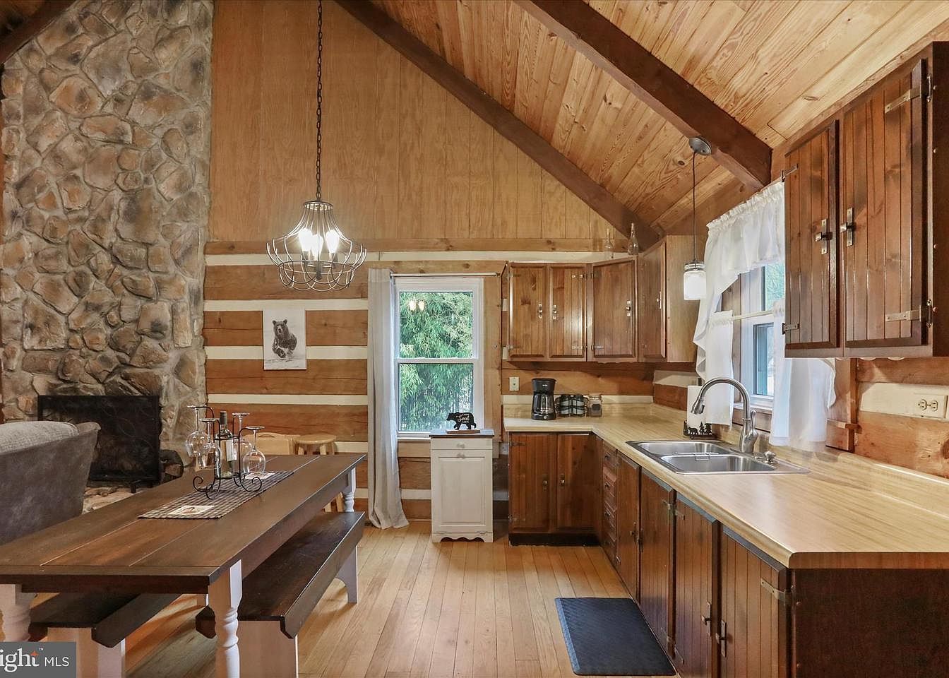The kitchen exudes a warm, rustic charm, featuring exposed wooden beams and a high slanted ceiling. Honey-toned wood cabinets complement the natural wood paneling and log walls. A large stone fireplace creates a cozy focal point, while the dining table invites gatherings. Rustic light fixtures enhance the ambiance, casting a soft glow. The countertops, a light wood, provide ample workspace, contrasting with the dark cabinetry. A deep window allows natural light, enhancing the inviting atmosphere. Simple decorative elements, like a framed animal print on the wall, add a touch of personality to the space, reinforcing its homely feel.