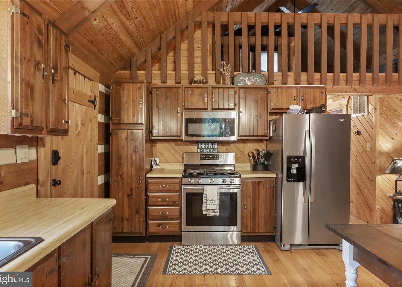 This kitchen features rustic wooden cabinetry, showcasing a warm and inviting cabin aesthetic. The walls are adorned with natural wood paneling, complemented by a light-colored countertop that enhances the inviting atmosphere. A stainless steel range and refrigerator provide a modern touch, contrasting with the traditional wood elements. The floor is made of polished hardwood, adding to the warmth of the space. A decorative rug with geometric patterns sits beneath the sink area, enhancing comfort. Above the cabinets, decorative items add personality, while natural light filters through openings, brightening the space and accentuating its cozy feel.