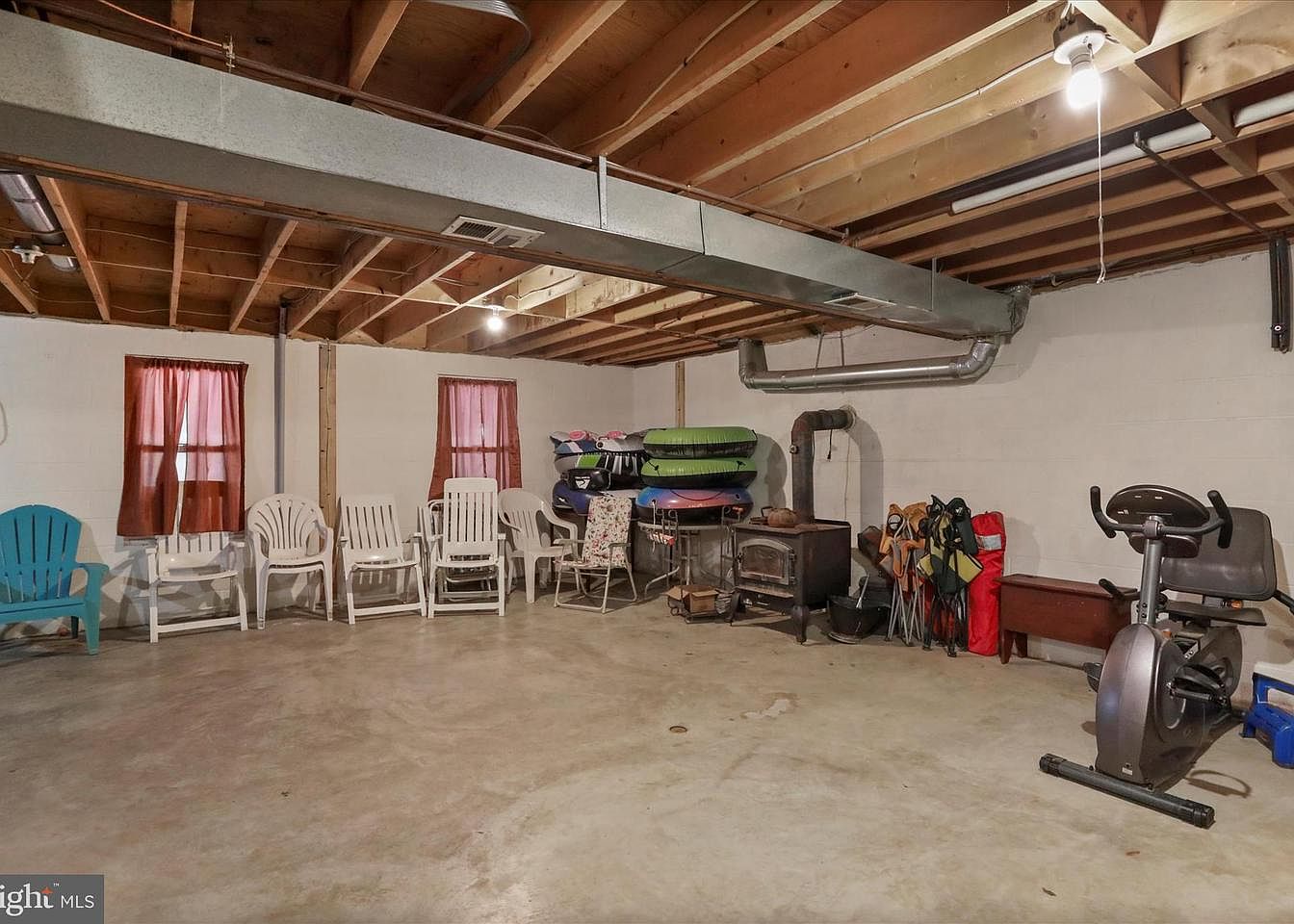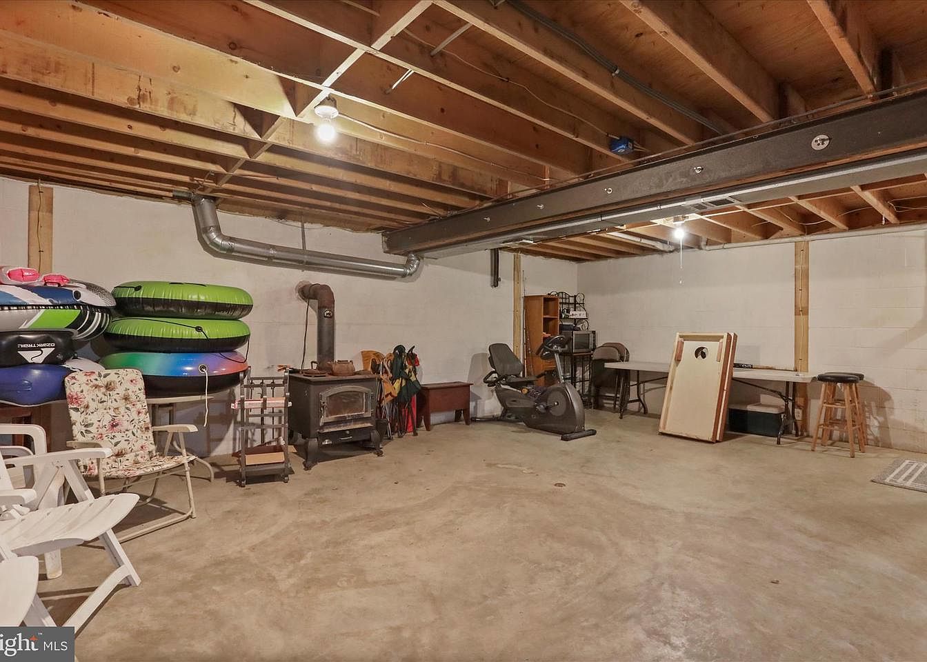 A spacious basement showcasing a functional layout, with concrete flooring and exposed wooden beams overhead adding a rustic touch. The walls are simple, painted white, enhancing the airy feel. Bright lighting illuminates areas where exercise equipment resides, alongside a traditional wood stove for warmth. Inflatable tubes stacked against the wall suggest a playful, outdoor-oriented lifestyle. A mix of furnishings, including plastic chairs and folding tables, provides options for activities. The minimalist design emphasizes practicality, making it an ideal space for storage and recreation while maintaining a raw, unfinished charm characteristic of basements.