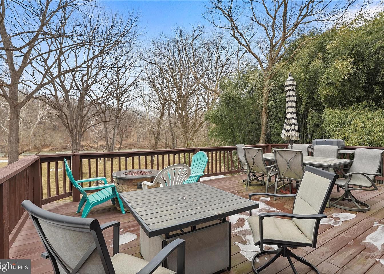 This outdoor deck offers a spacious entertaining area, featuring a modern rectangular table surrounded by multiple comfortable chairs. The wooden flooring enhances the rustic charm, complemented by a few mismatched lounge chairs in teal and white. A fire pit, made of stone, adds warmth and invites gatherings. The striped umbrella provides shade against the expansive sky, while the trees in the background create a tranquil, natural backdrop. The combination of earthy tones and vibrant chair colors brings a refreshing vibe, emphasizing relaxation and outdoor enjoyment, making this space perfect for family gatherings or tranquil retreats.