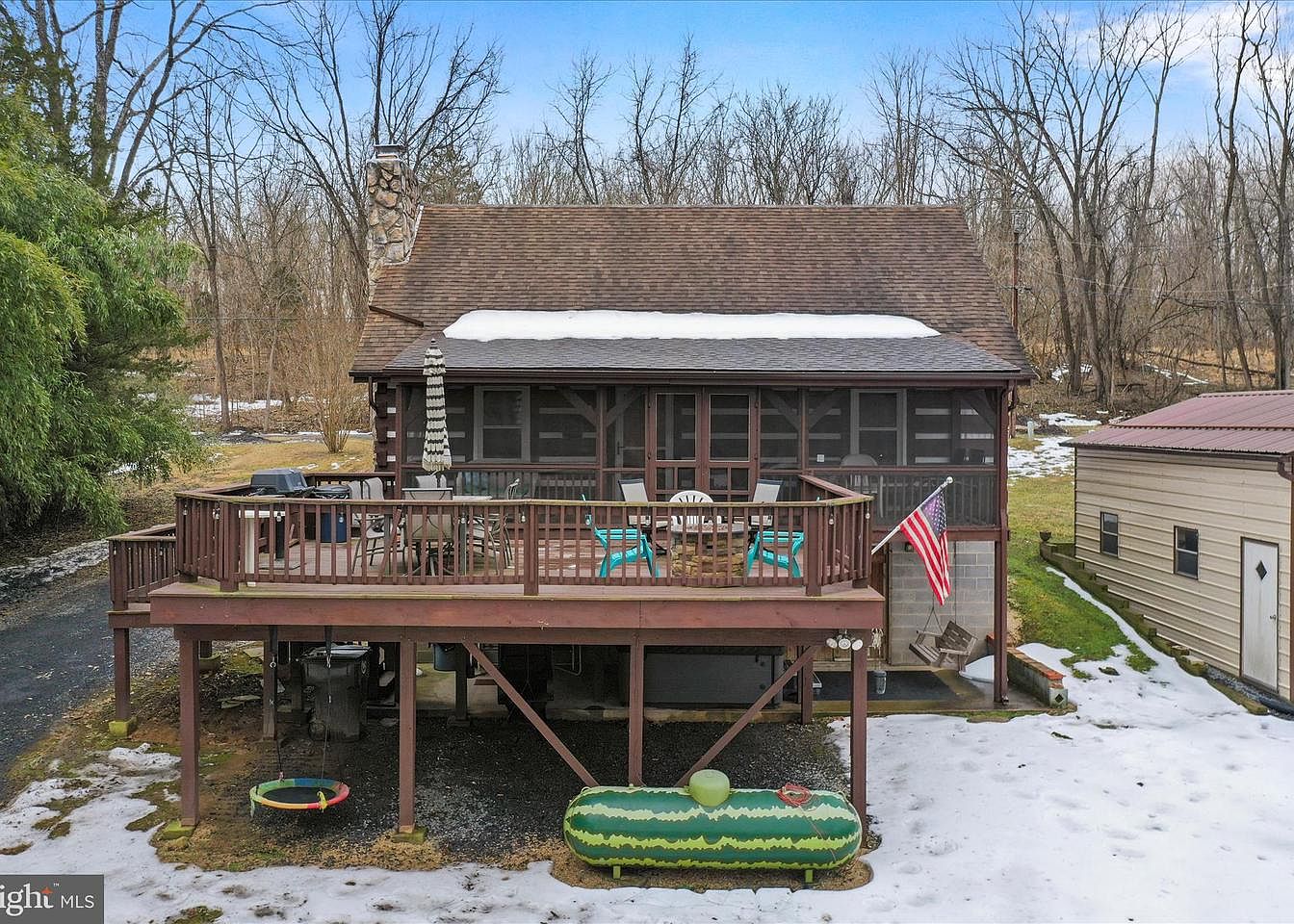 A spacious wooden deck extends from the cozy home, showcasing a rustic aesthetic. The deck is adorned with several teal and white chairs, offering a vibrant contrast to the surrounding natural wood tones. An awning with alternating stripes provides shade, while a stone chimney rises prominently, adding character. The backdrop features a winter landscape with patches of snow and leafless trees, enhancing the tranquil atmosphere. A unique, watermelon-shaped propane tank is positioned underneath the deck, adding a whimsical touch. Nearby, a swing hints at family-friendly outdoor fun, completing this inviting space for relaxation and gatherings.