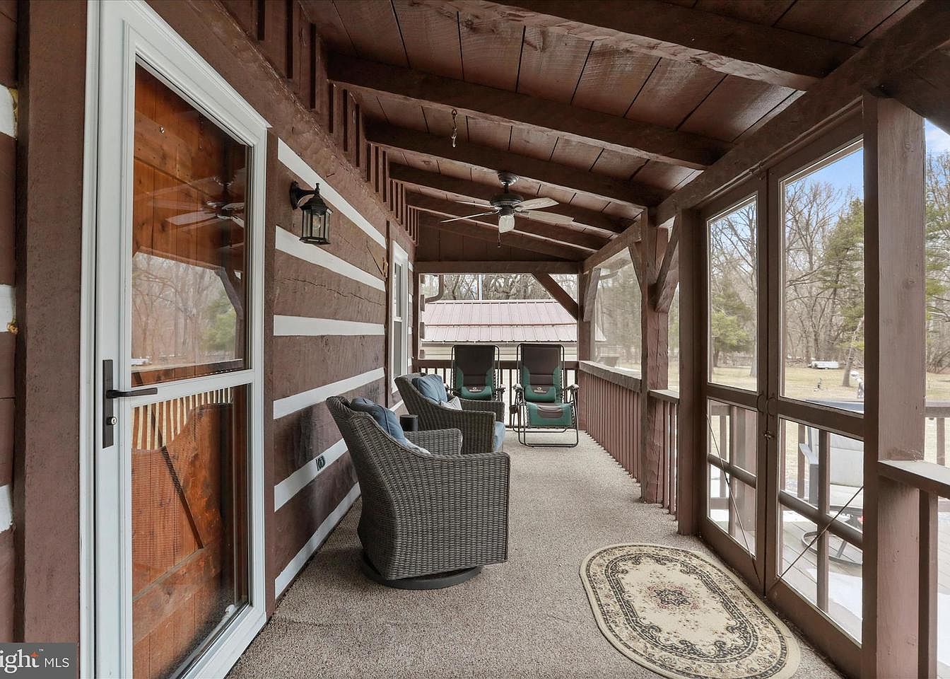 A cozy porch features a rustic design with exposed wooden beams and log siding, enhanced by a warm brown color scheme. The flooring is carpeted for comfort, complemented by an area rug that adds a touch of elegance. Two stylish wicker chairs with blue cushions invite relaxation, while two folding lounge chairs are positioned towards the back, suggesting an ideal spot for enjoying the outdoors. Natural light filters through large screens, creating a breezy ambiance. A modern ceiling fan hangs above, providing comfort on warmer days, and a vintage-style lantern adds charm to the space.