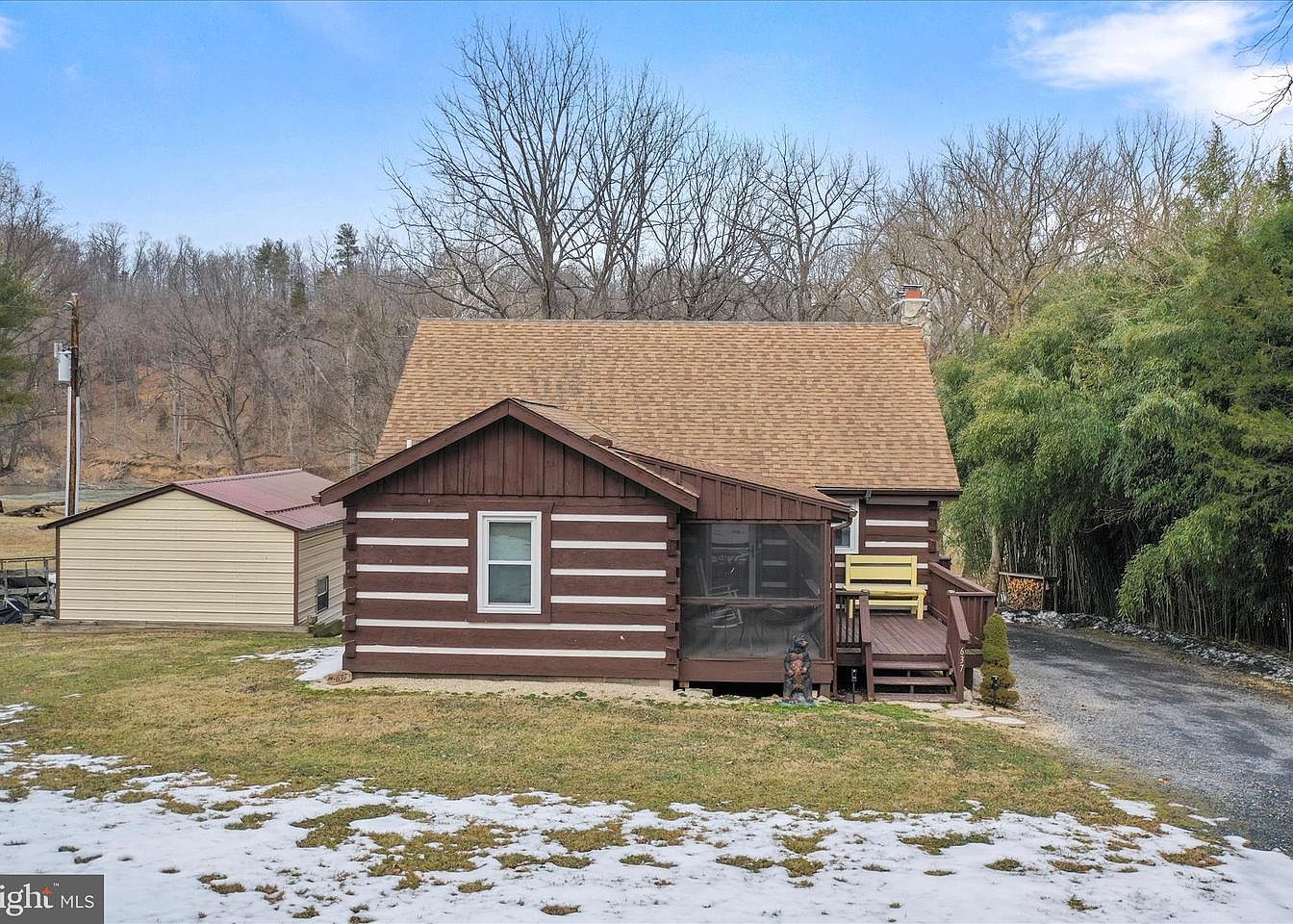 A charming, rustic log cabin features a blend of natural wood tones with horizontal white-painted accents. The structure showcases a steeply pitched roof covered in light brown shingles. A small screened porch extends from the side, highlighted by a pair of yellow chairs, inviting relaxation. The yard is partially covered with remnants of snow, contrasting with the green grass and surrounding landscape. Sparse trees stand in the background, revealing a tranquil, wooded atmosphere. A gravel driveway curves around the house, providing access to a nearby storage shed and enhancing the peaceful, country setting of this historic home.