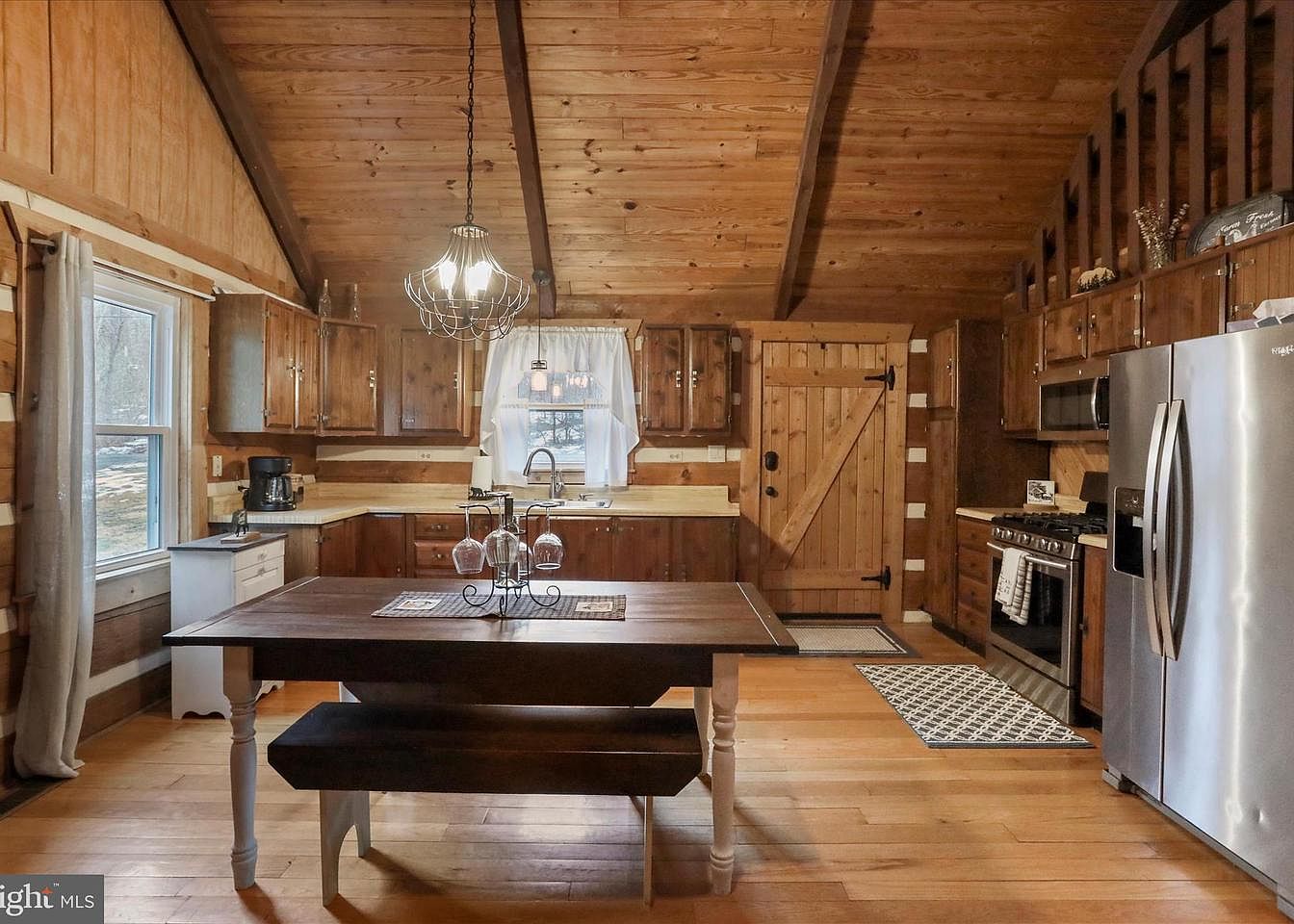 This kitchen features a rustic and cozy ambiance, characterized by wooden walls and ceilings that enhance its charming appeal. The cabinetry is crafted from rich brown wood, complementing the warm, natural tones of the space. A spacious wooden table with turned legs dominates the area, accompanied by a matching bench. A decorative light fixture hangs above, casting a warm glow. The kitchen is equipped with modern appliances, including a stainless steel refrigerator and a gas stove, juxtaposed against the traditional wooden elements. Large windows illuminate the space, inviting natural light and offering views of the outdoors.