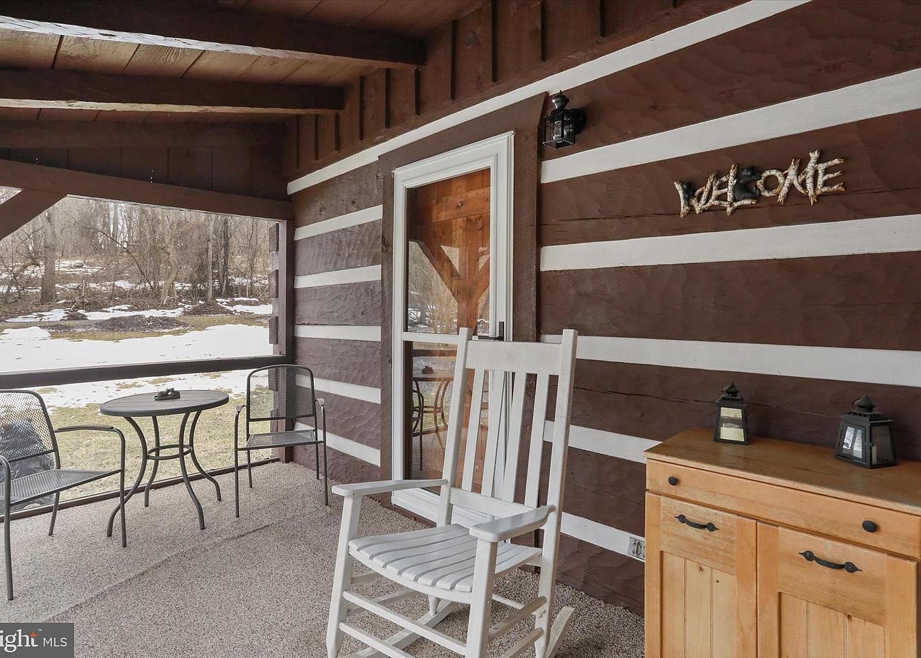 This front porch features a rustic charm with its earthy brown wooden logs contrasted by bright white horizontal stripes. A classic rocking chair invites relaxation, while a small round table with black wrought iron chairs suggests space for casual outdoor meals or coffee. Natural light filters through large windows, enhancing the warm ambiance. The wooden floor adds a tactile element, complemented by a welcoming ‘Welcome’ sign crafted from branches. Two lanterns flanking the entry add a touch of traditional elegance, illuminating the porch during twilight, making it a cozy spot to unwind and enjoy the surrounding nature.
