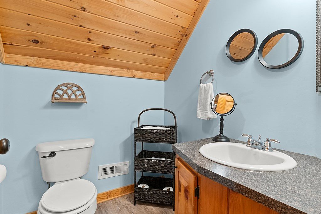 This bathroom features a charming layout with sloped ceilings accentuated by warm wooden paneling. The walls are painted a soft blue, creating a calming atmosphere. A simple white toilet sits adjacent to a sleek dark countertop, which houses a round sink. Below, wooden cabinets add storage with their rich finish, contrasting elegantly with the countertop. A stylish black metal rack holds essentials neatly, and two circular mirrors above the sink enhance the space. Natural light floods in, emphasizing the inviting warmth of the wood and the cool tones of the wall, making this area feel cozy and bright.