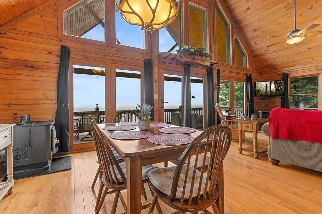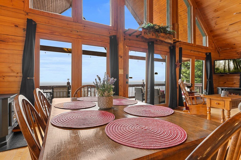 This dining area features a rustic wooden table set for gatherings, with coordinating braided red placemats adding a touch of color against the rich wood tones. The walls, made of warm, natural wood, complement the high, vaulted ceiling that showcases exposed beams. Large windows line the space, allowing ample natural light and offering stunning views outside, while dark drapes provide contrast and privacy. Decorative elements like a potted plant center a cozy atmosphere, and a wooden sign above the windows adds a personal touch. The inviting ambiance is perfect for casual dining and socializing.