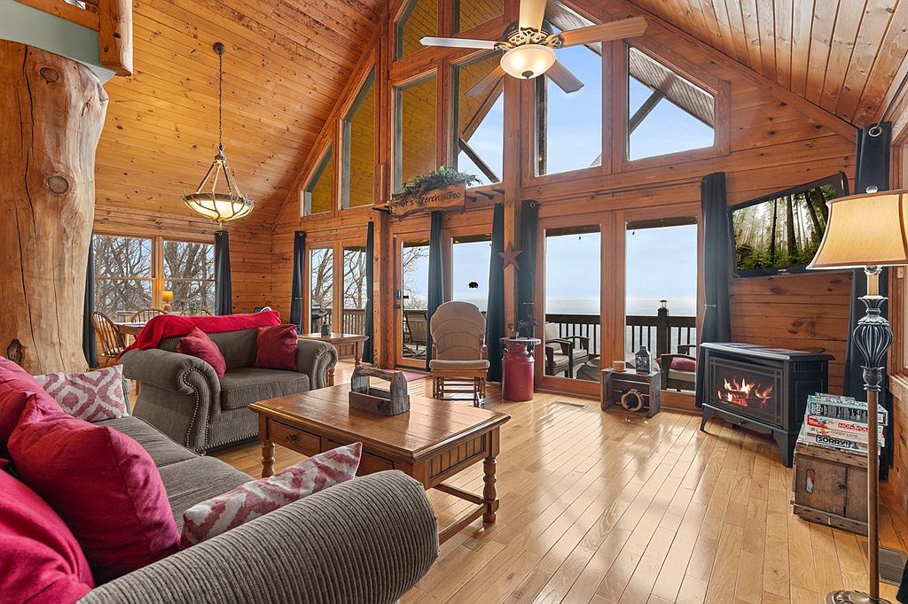 This cozy living room features warm wooden paneling and a soaring ceiling that creates an inviting atmosphere. Large windows flood the space with natural light, offering scenic views. The rich honey-toned wooden floor contrasts beautifully with the dark curtains. A rustic wooden dining table surrounded by classic spindle-back chairs sits gracefully in the center, paired with round placemats. Accents include a comfy couch draped with a vibrant red throw and a charming side table. A traditional wood stove adds to the room’s warmth, while a flat-screen TV and natural decor, like potted plants, enhance the cozy aesthetic.