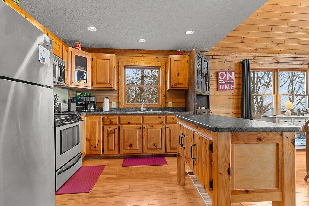A cozy kitchen featuring wooden cabinetry with a natural finish and a granite countertop. Stainless steel appliances, including a fridge and stove, contrast with the warm wood tones. The layout includes a central island providing extra prep space and storage. Large windows allow natural light to flood the room, enhancing its inviting atmosphere. A cheerful sign hanging on the wall adds a playful touch, while vibrant pink mats on the floor introduce color. The room’s wooden walls create a rustic, cabin-like feel, complemented by the warm, subtle lighting and views of the surrounding trees.