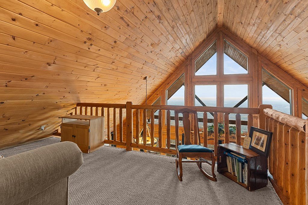 A cozy loft area with a warm, inviting atmosphere features natural wood paneling that creates a rustic appeal. The high, angled ceiling enhances the spacious feel, accentuated by large, triangular windows that offer stunning views and ample natural light. A plush, light-colored carpet contrasts with the wooden elements, adding comfort. A simple wooden railing provides safety while keeping the space open and airy. Furnishings include a small bedside table and a vintage chair with a blue cushion, complemented by a decorative wooden box containing books. The overall aesthetic combines rustic charm with contemporary comfort, perfect for relaxation.