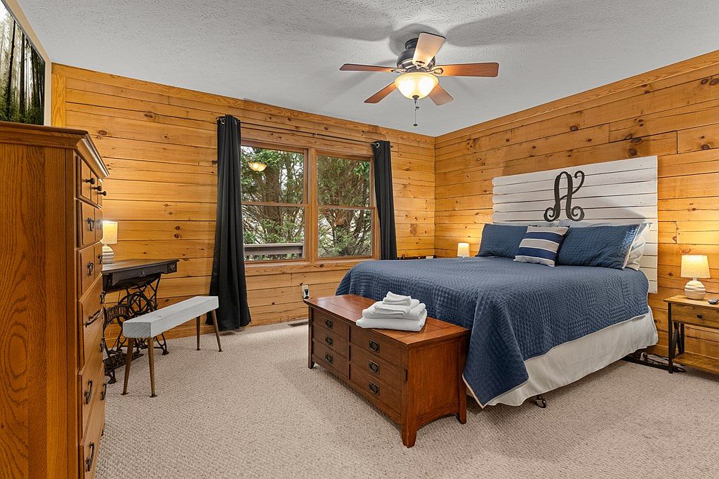 This cozy bedroom features natural wood paneling that creates a warm, rustic atmosphere. The focal point is a large bed with a navy blue quilt, accented by striped pillows. A unique wooden headboard adds character, while two bedside lamps provide soft lighting. The room includes a vintage wooden dresser and a small bench for seating, enhancing functionality. Dark curtains frame the windows, allowing glimpses of greenery outside. A plush carpet underfoot adds comfort, while the ceiling fan offers a practical touch. Overall, the space harmonizes comfort and style, inviting relaxation within its tranquil setting.