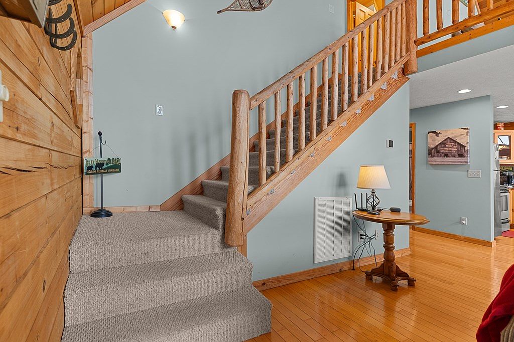 This entryway features a warm and inviting layout, highlighted by natural wood elements. A sturdy staircase with a log railing curves upward, leading to a cozy upper level. The walls are painted a soft blue, creating a contrast with the rich, textured wood paneling on the adjacent wall. A plush, neutral-colored carpet lines the stairs, adding comfort underfoot. Natural light flows through nearby windows, illuminating a round side table next to a decorative lamp. On the wall, artwork brings a rustic touch, while hooks and a sign add practicality and charm to the space.