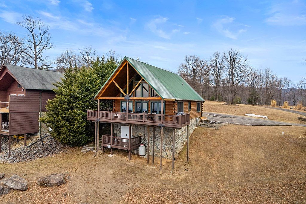 This image shows the exterior of a charming log cabin-style home set on elevated supports, surrounded by nature. The house features a distinctive green metal roof and tall, sloped gables adorned with large windows that invite natural light. The walls are primarily wooden with stone accents at the base, blending harmoniously with the rustic environment. A wraparound balcony provides outdoor space with wooden railings. The property is nestled among trees, showcasing a tranquil setting. The landscape is marked with patches of grass and rocky areas, enhancing the rustic appeal while creating a serene atmosphere.