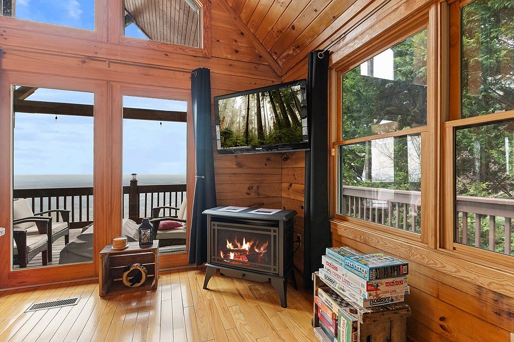 This sunroom features large, panoramic windows that bring in natural light and provide stunning views of the outdoors. The wooden walls, crafted from warm-toned timber, create a rustic atmosphere. A compact, stylish black stove fireplace stands at the center, surrounded by a wooden crate table holding decorative items. To one side, comfortable wicker chairs with soft cushions invite relaxation. A flat-screen TV is mounted nearby, blending modern technology with cozy charm. The room is filled with board games on a crate, adding a playful touch, while dark curtains frame the windows, enhancing the warm, inviting ambiance.