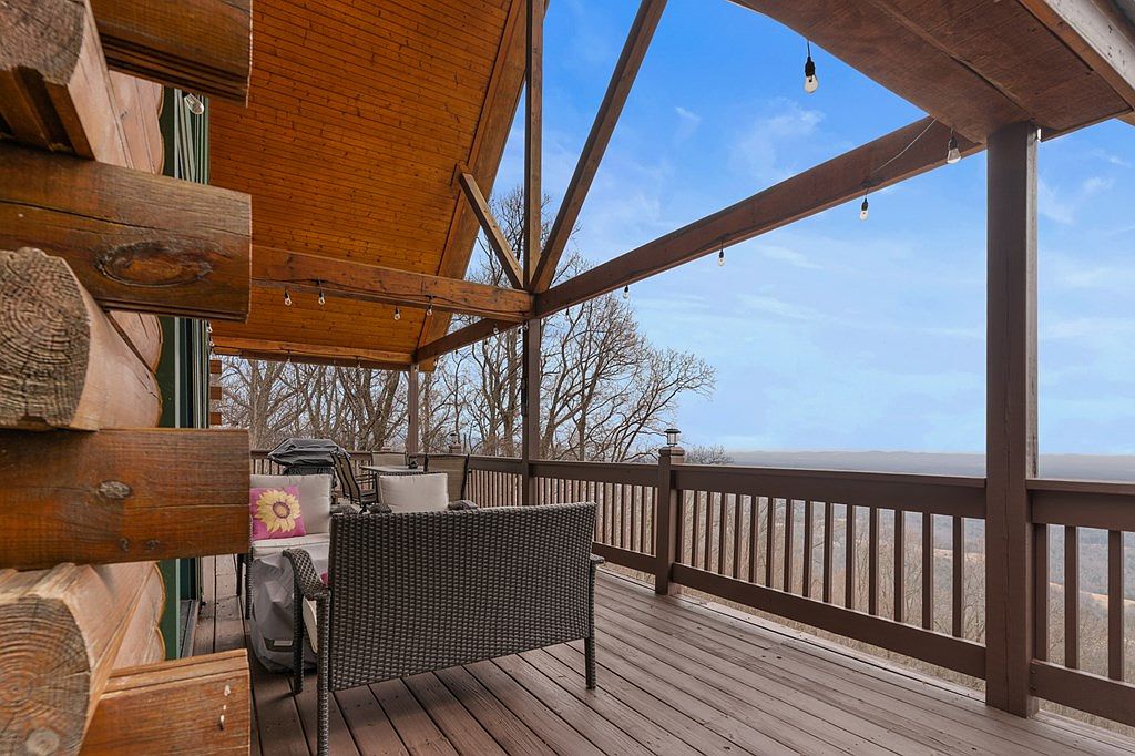 A spacious wooden deck is adorned with a rustic wooden ceiling and exposed beams, enhancing the cabin aesthetic. The floor features horizontal planks, blending seamlessly with the natural surroundings. A contemporary wicker seating arrangement, complete with soft cushions and a vibrant floral accent pillow, invites relaxation. Soft, warm lighting from hanging bulbs adds a cozy ambiance. The expansive view reveals distant treetops and hills, promoting a serene outdoor lounge experience. The design harmonizes contemporary and rustic elements, creating an inviting space suitable for gatherings or quiet contemplation amidst nature.