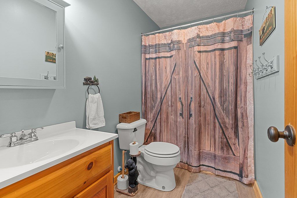 The bathroom features a calming light blue wall color, creating a serene atmosphere. A sleek white countertop complements the warm wood cabinetry, which adds a rustic charm. A mirror above the sink reflects the soft light, enhancing the space’s brightness. The shower curtain showcases a rustic barn door design, injecting character while serving as a focal point. A plush beige mat lies on the floor, adding comfort underfoot. The space is accessorized with a small wooden basket and a decorative bear figurine, contributing to the country aesthetic. A hook rack on the wall offers practical storage for towels.
