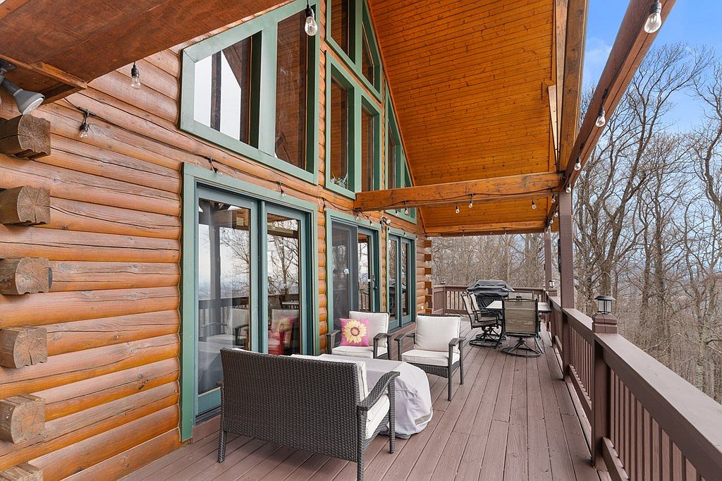 This patio showcases a rustic charm with its log cabin structure featuring natural wood siding. Large, tall windows framed in green allow ample natural light and outdoor views, enhancing the spacious feel. The porch is partially covered by a broad overhang, offering shelter and an inviting atmosphere. Comfortable seating options include dark wicker chairs and a loveseat adorned with colorful cushions, creating a cozy lounging area. Beneath a warm, wooden ceiling, soft pendant lights hang to illuminate evenings. The overall color palette combines earthy tones of brown and green, harmonizing with the surrounding trees for a serene environment.