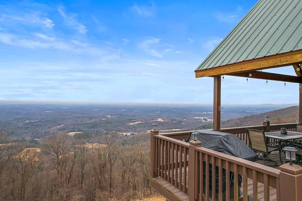 This outdoor deck features a wooden railing and an expansive view over the valley. The brown timber highlights the structure’s solid construction, combining modern aesthetics with a rustic charm. A covered area shelters a grill, and a dining set invites gatherings, all under a green metal roof that adds a contemporary touch. The backdrop consists of rolling hills and sparse trees, transitioning into the distant landscape under a clear blue sky. The combination of natural earth tones and the lush scenery creates a serene ambiance, ideal for relaxation and enjoying nature.