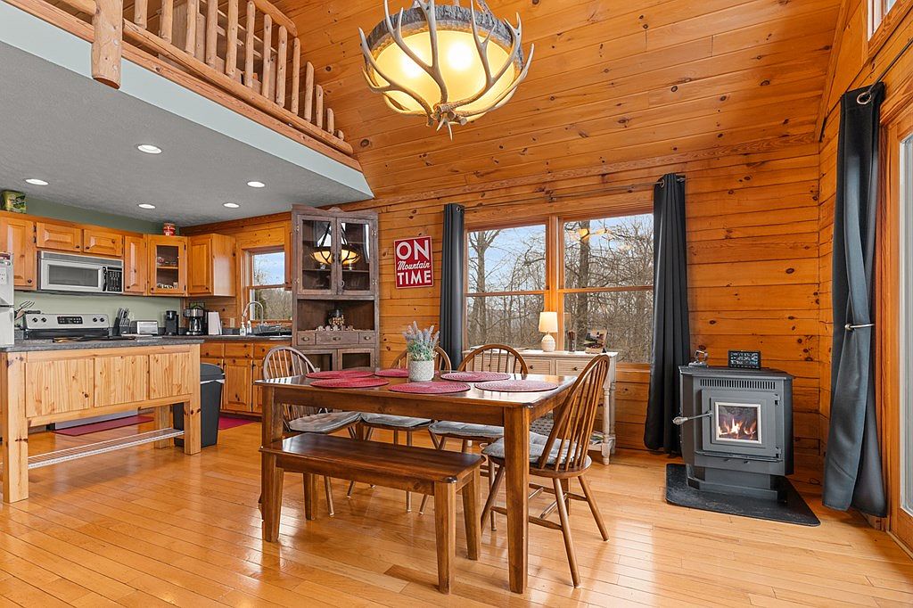 This inviting dining area seamlessly integrates with a rustic kitchen, highlighting wooden cabinetry and a spacious wooden dining table. The rich, warm tones of pine wood dominate the walls and flooring, bringing a cozy, natural ambiance. Large windows invite natural light, framed by elegant dark curtains, while a unique chandelier with antler motifs adds a charming focal point. A wood stove in the corner offers additional warmth, enhancing the cabin feel. Round chairs with cushions create a comfortable dining experience, while decorative items on the shelves and table add personal touches to the overall aesthetic.