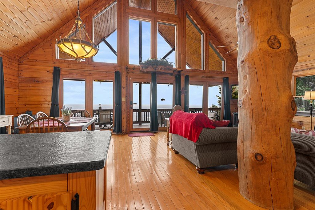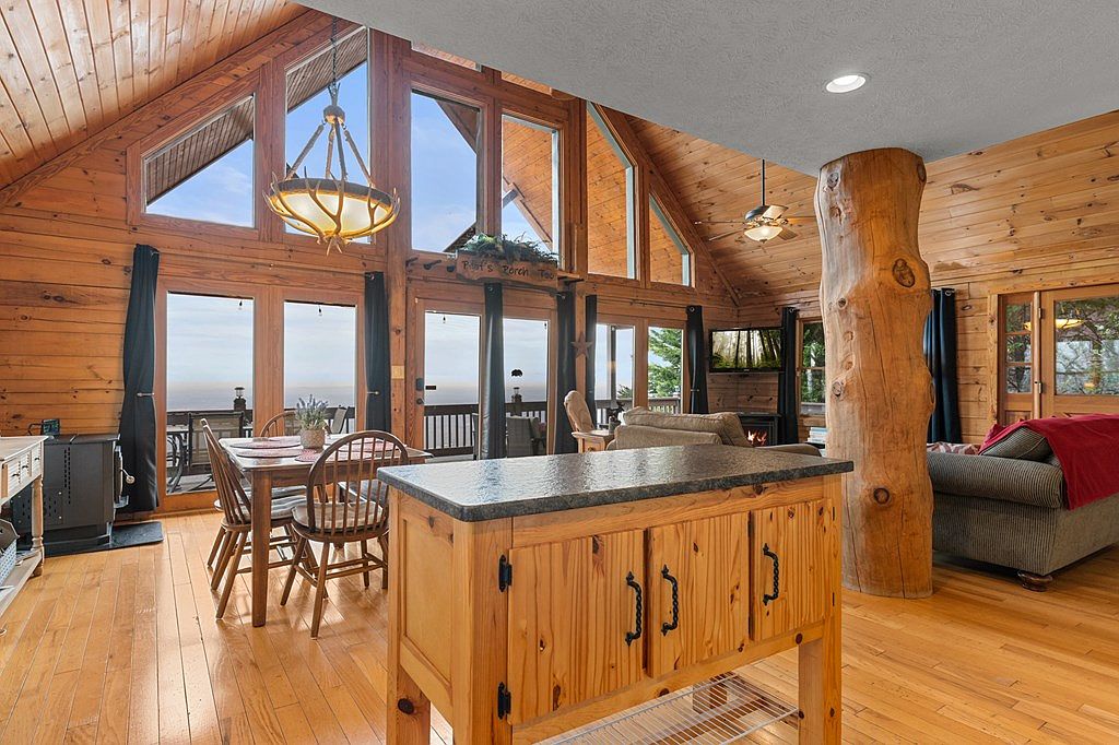 This great room features an open layout with high, vaulted ceilings and expansive windows providing panoramic views of the surrounding landscape. The warm wood paneling and flooring enhance the rustic charm, complemented by a polished black countertop on a wooden island. Natural light floods the space, highlighting a cozy seating area adorned with a plush couch draped in a crimson throw. A circular dining table with classic wooden chairs invites gatherings, while a central support column made of a tree trunk adds a striking organic element. Dark curtains frame the windows, creating a contrast to the inviting wood tones.