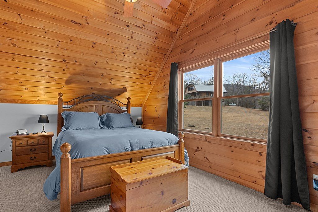 A cozy bedroom featuring warm wooden paneling and an a-frame ceiling gives a rustic charm. A queen-sized bed dressed in soft blue bedding rests against the wall, flanked by two light-wood nightstands, one holding a stylish lamp. A small, wooden chest at the foot of the bed provides extra storage and accentuates the rustic feel. Large windows framed by dark curtains frame views of nature outside, enhancing the room’s warmth with natural light. The neutral-toned carpet adds a soft texture underfoot, contributing to the inviting and serene atmosphere, ideal for relaxation and comfort in a pastoral setting.