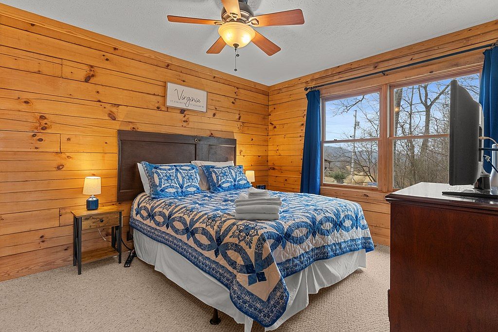 A rustic bedroom features warm wooden walls, enhancing the cozy ambiance. A queen-sized bed, adorned with a blue and white quilt, centers the room. Accent pillows complement the bedding’s intricate pattern. Beside the bed, a small nightstand holds a blue lamp, echoing the quilt’s color scheme. To the right, a sleek television rests on a wooden dresser, providing modern entertainment. The large windows, framed with deep blue curtains, invite natural light and showcase views of the outdoors. The soft beige carpet adds warmth, while the ceiling fan overhead maintains air circulation, finalizing this inviting retreat.