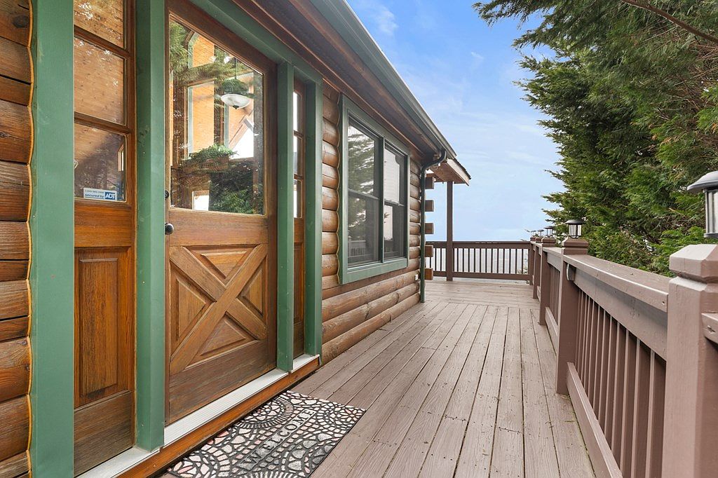This entryway features a rustic charm accentuated by log cabin architecture. The light brown wooden logs create a warm, inviting façade. A sturdy wooden door with a diamond-shaped panel and green trim offers a classic touch. Large windows alongside the door allow natural light to flood the space, enhancing the cozy atmosphere. The deck is made of warm-toned wooden planks, extending outward, bordered by a brown railing. Decorative elements like a patterned doormat add a personal touch. Surrounding greenery complements the natural aesthetics, creating a serene entrance that harmonizes with the outdoors.